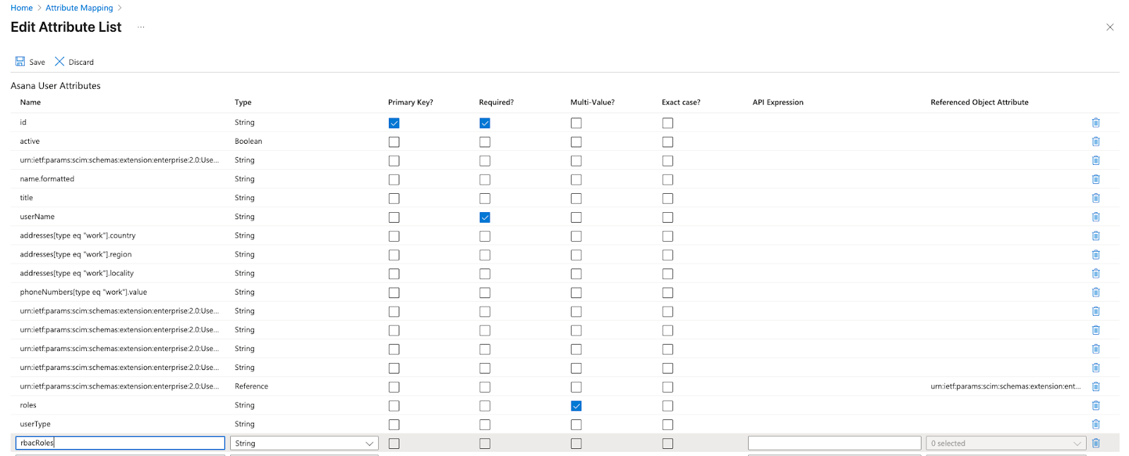 Pada halaman Edit Daftar Atribut, tambahkan atribut pengguna baru bernama rbacRoles sebagai jenis String. Simpan daftar atribut.