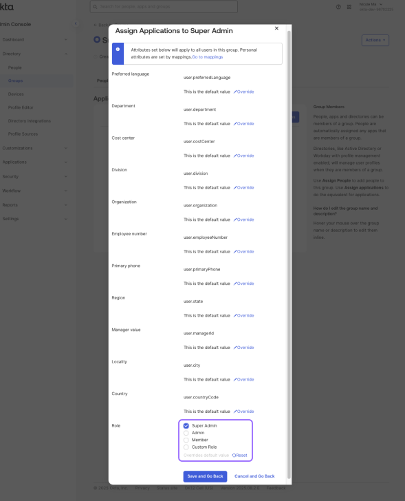 Se imposti i ruoli di Asana su Okta, qualsiasi modifica apportata nella console di amministrazione ai ruoli utente verrà sovrascritta quando viene attivato un aggiornamento delle informazioni di quell’utente su Asana. Ti consigliamo di scegliere di gestire i ruoli esclusivamente su Asana o esclusivamente su Okta.