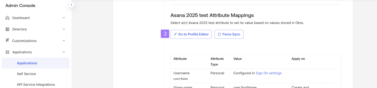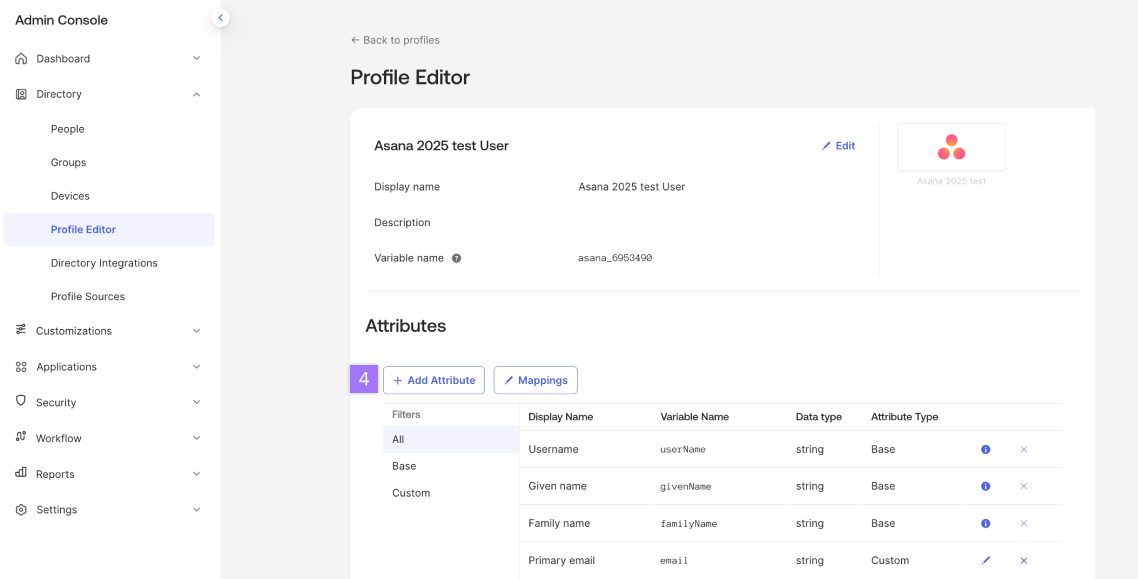 Vai all'applicazione di Asana, vai alla scheda **provisioning **, quindi vai a **Profile Editor** (Editor profilo) e clicca su + Add Attribute (+ Aggiungi attributo).