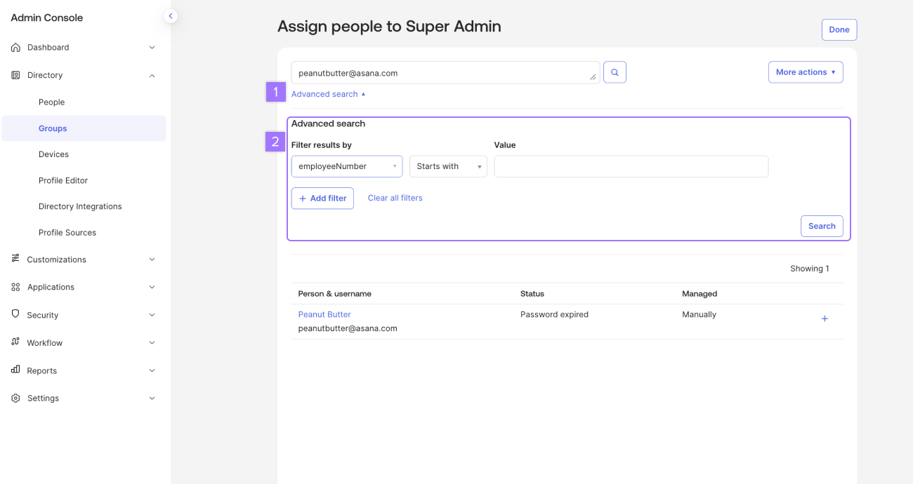 Kliknij wyszukiwanie zaawansowane i użyj filtrów, aby zbiorczo przypisać odpowiednich użytkowników do grupy lub wyszukać użytkowników indywidualnie.