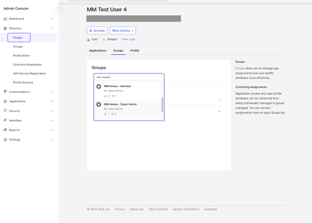 Asana obsługuje obecnie jedną rolę na użytkownika. Gdy użytkownicy są przypisani do wielu ról (tj. administratora i członka) w Okta, rola, którą otrzymują, będzie domyślnie przypisana do grupy ról o najwyższym priorytecie. Sugerujemy, aby role z wyższymi uprawnieniami znajdowały się wyżej na liście priorytetów, tak aby w przypadku, gdy użytkownik jest zarówno członkiem, jak i administratorem, jego domyślną rolą był administrator. Jeśli masz skonfigurowane role niestandardowe, umieść rolę niestandardową z większą liczbą uprawnień wyżej na liście priorytetów. W aplikacji Asana w sekcji „Applications” (Aplikacje) przejdź do sekcji „Assignments” (Przypisania), a następnie „Groups” (Grupy). Zmień kolejność grup według priorytetu, używając uchwytu z boku karty.