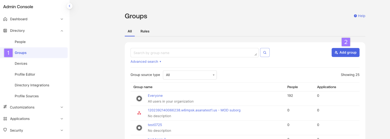 Asana stöder för närvarande en roll per användare. När användare tilldelas flera roller (dvs. administratör och medlem) i Okta kommer rollen de får att vara standard för den rollgrupp som har högst prioritet. Vi föreslår att du rankar roller med högre behörigheter högre i prioriteringslistan, så att om en användare är både medlem och administratör blir deras roll administratör som standard. Om du har anpassade roller kan du placera den anpassade rollen med fler behörigheter högre upp i prioritetslistan. Gå till Tilldelningar och sedan Grupper under Asana-applikationen i Applikationer. Ordna om grupperna efter prioritet genom att använda handtaget på sidan av kortet.