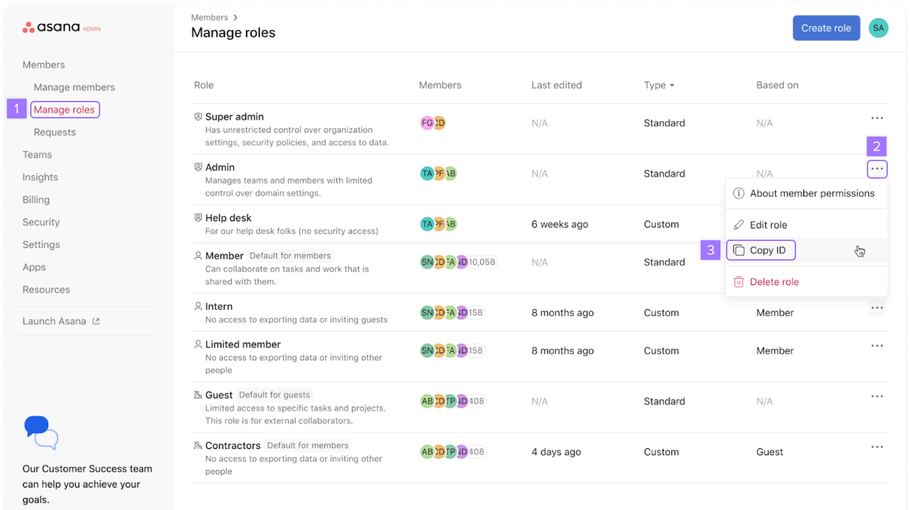 Gå till Asanas adminkonsol och gå till fliken Hantera roller. Klicka på trepunktsikonen och klicka på ”Kopiera ID”.