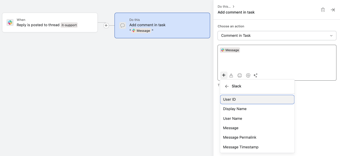 Lorsque vous créez une règle de déclenchement d’application Slack, vous pouvez inclure des variables de message Slack qui rempliront automatiquement la tâche avec des informations Slack.