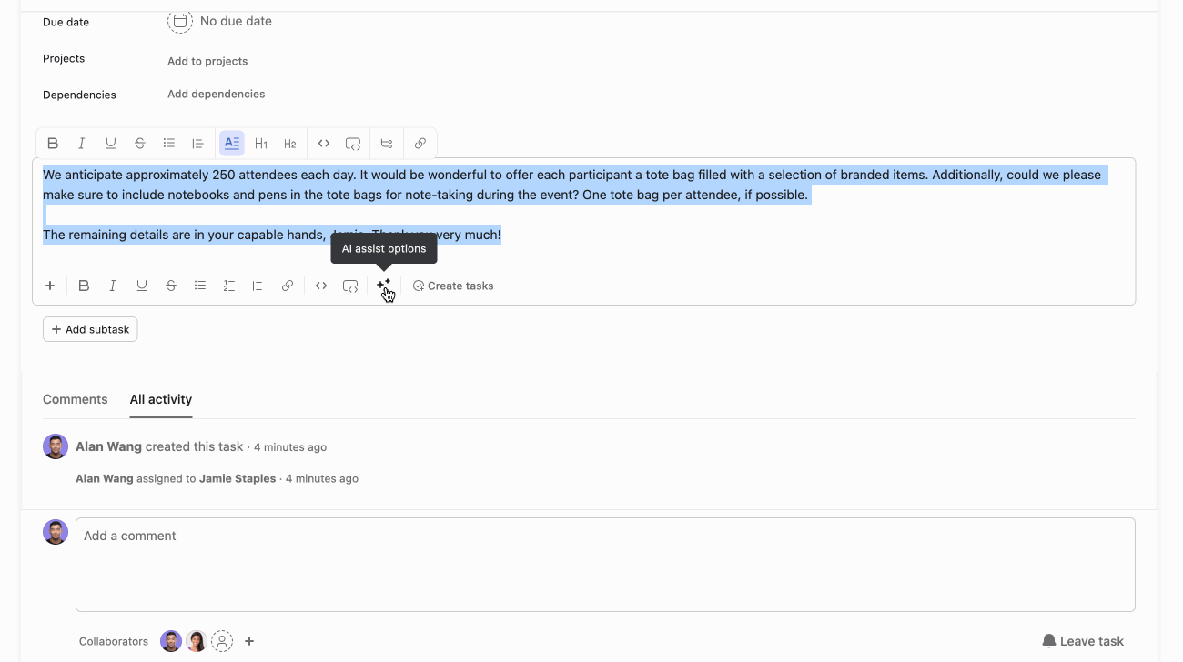 Smart editor can be used within task descriptions, comments, and status editor. Simply click the AI assist options button in the rich text toolbar to get started.