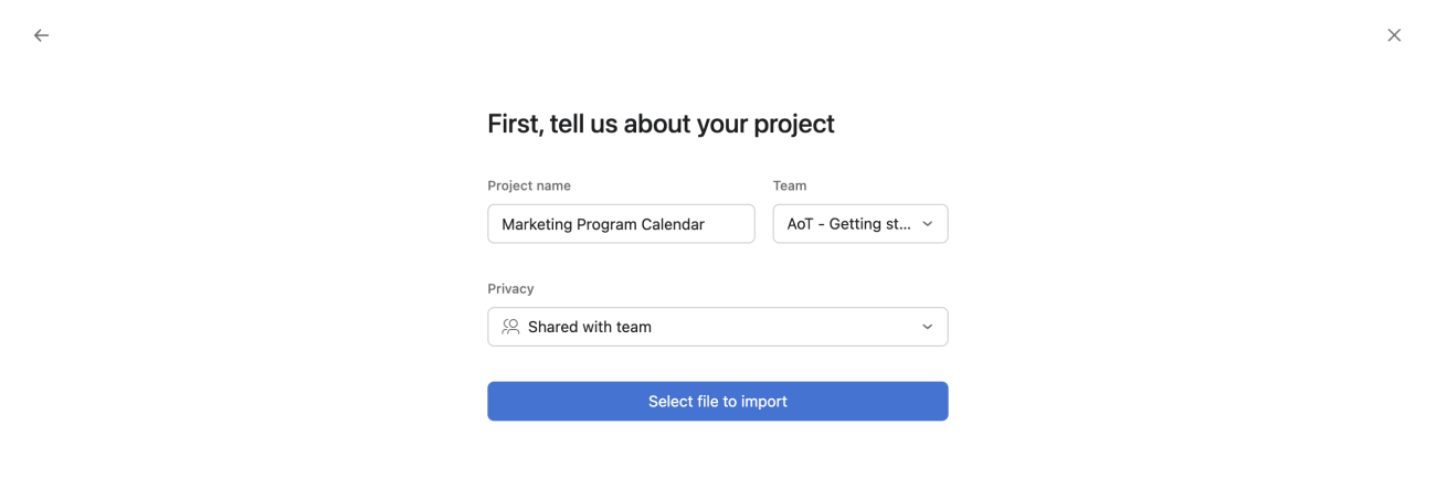 From the next screen, add your project's name, the team and privacy settings. Then click Select file to import.