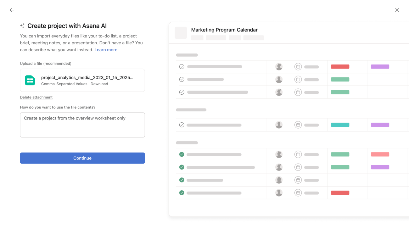 Smart import allows you to quickly convert documents into tasks and projects using Asana AI. Import files such as spreadsheets, presentations, and PDFs, and Asana AI will analyze the content to generate structured tasks or projects.