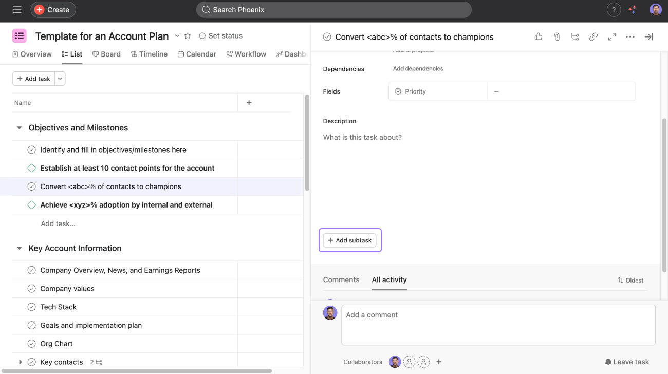 Użytkownicy Asany mogą ustawić wartości pól, w tym pola niestandardowe w podzadaniach oraz zwijać i rozwijać podzadania, w zależności od stopnia szczegółowości, jaki chcą zobaczyć.