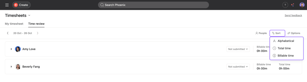Les réviseurs de feuilles de temps peuvent modifier l’ordre d’affichage des membres de l’équipe à l’aide de la fonctionnalité Trier.