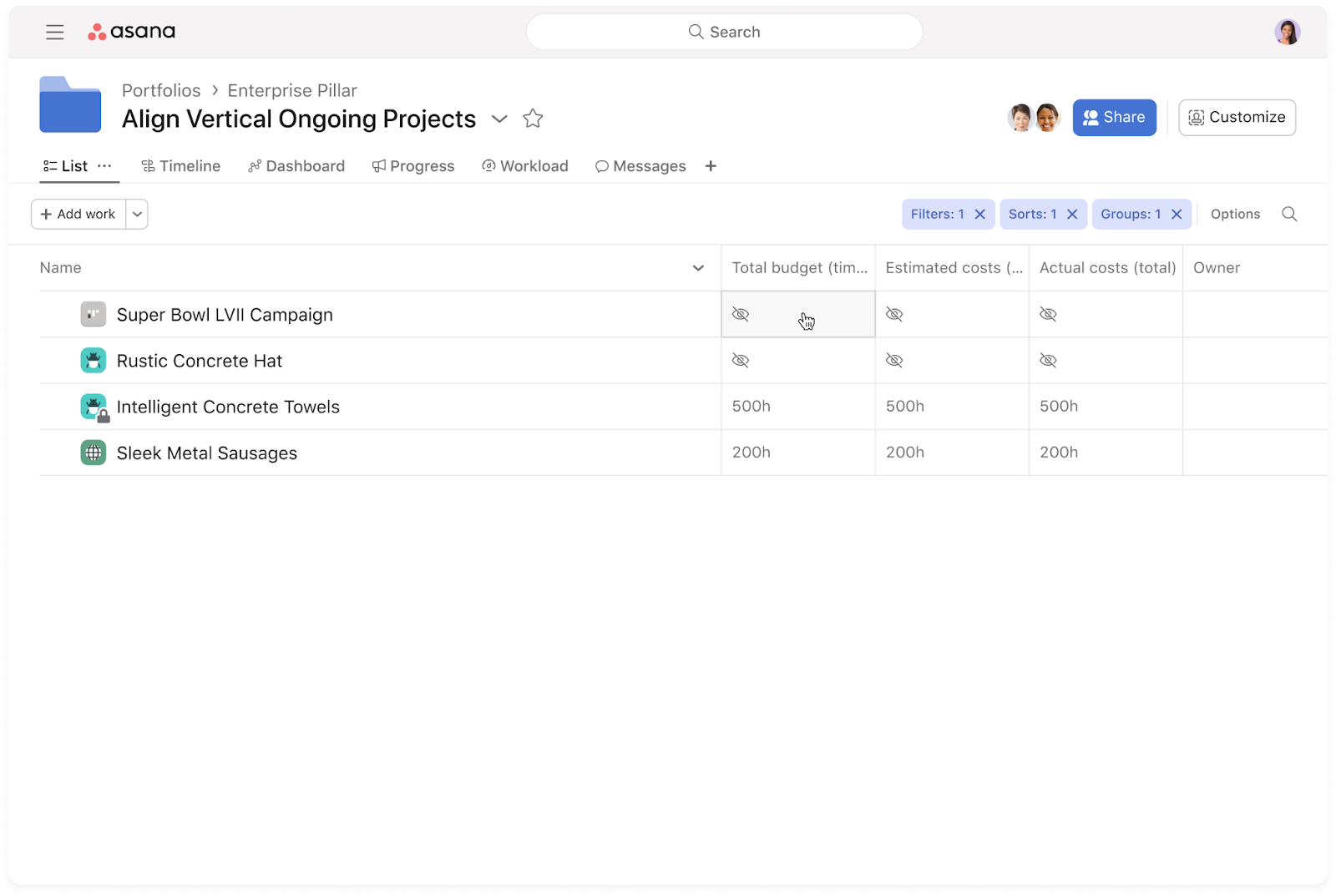 Les utilisateurs peuvent afficher les budgets de plusieurs projets au niveau du portefeuille pour comprendre les agrégations de coûts ou de temps, en fonction du type de budget d’un projet.
