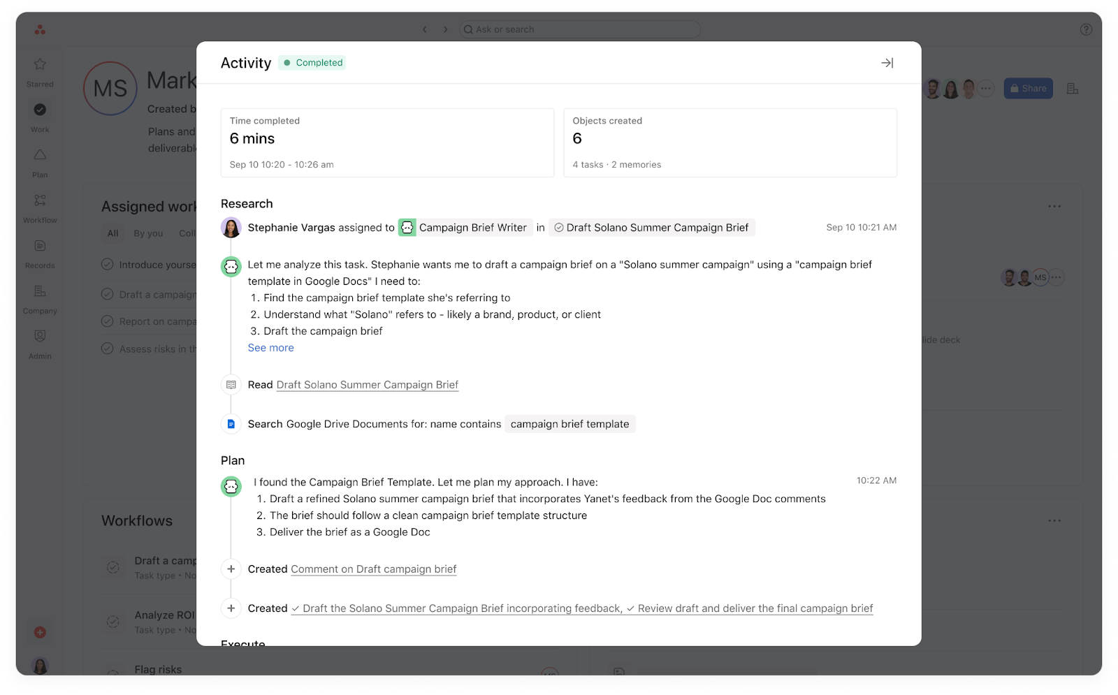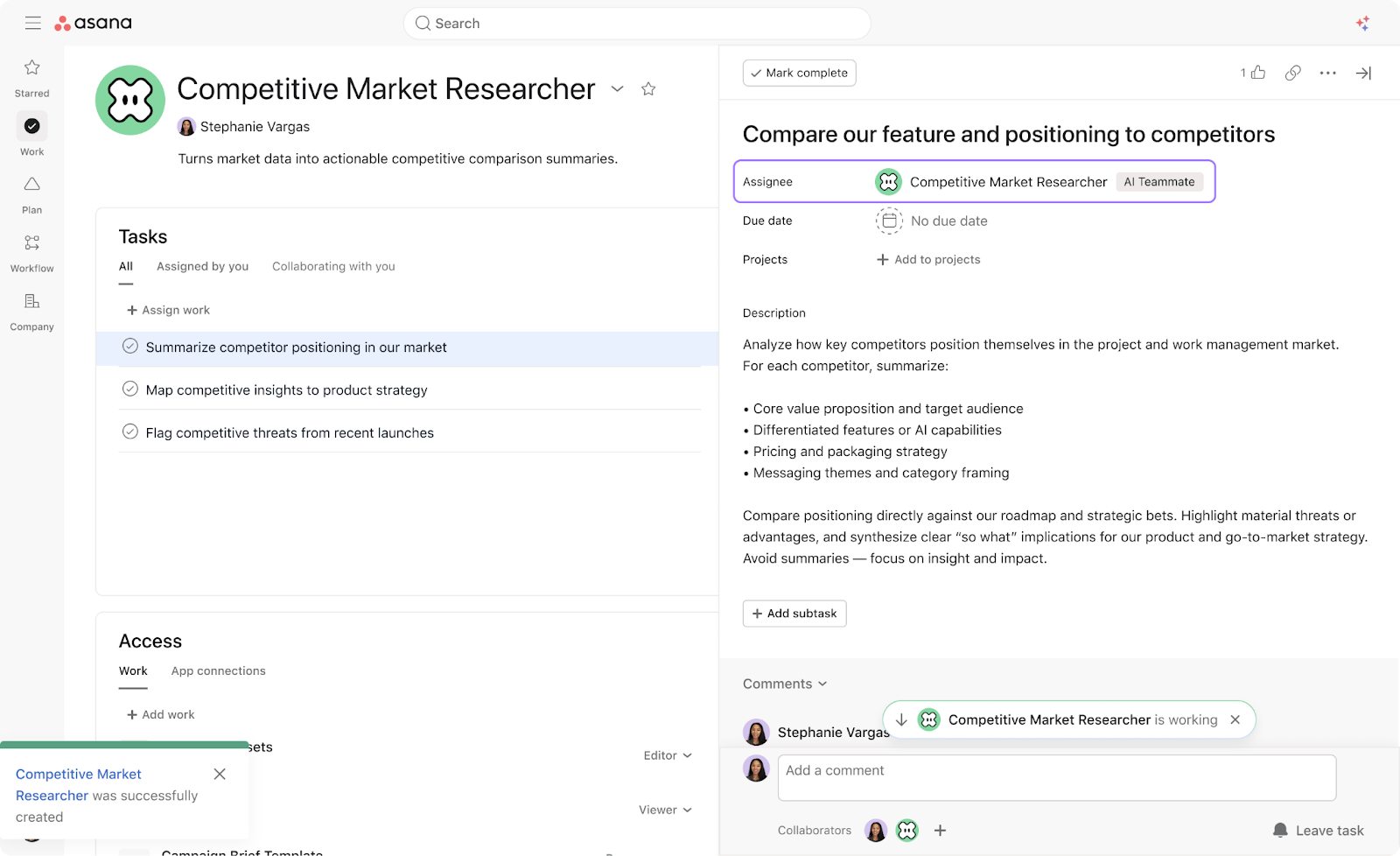 Asigna una tarea directamente a tu compañero de equipo de IA. El compañero de equipo leerá el título, la descripción y el contexto de la tarea y, a continuación, comenzará a trabajar en ella, publicará comentarios, creará subtareas o realizará otras acciones según lo definido en sus instrucciones.
