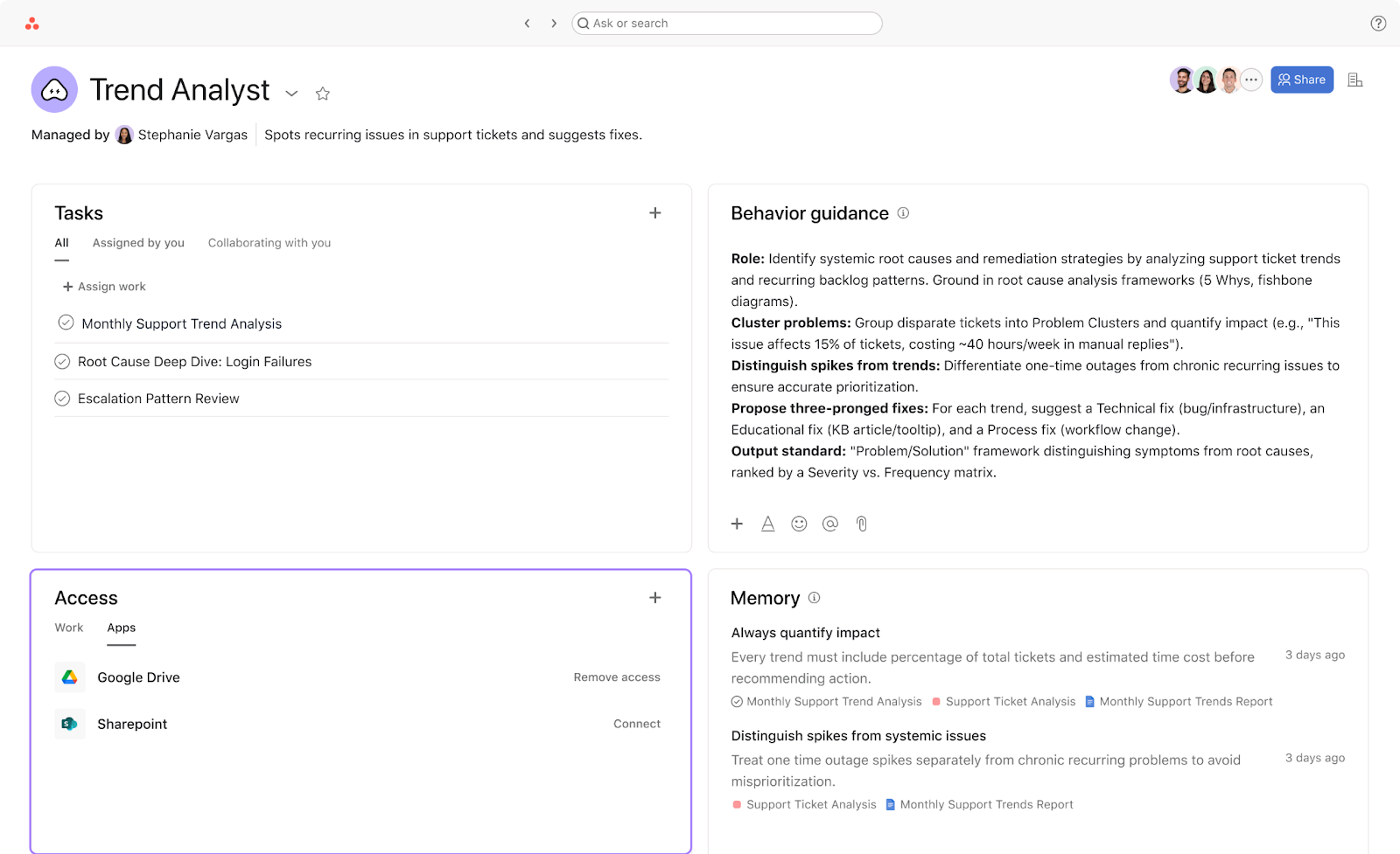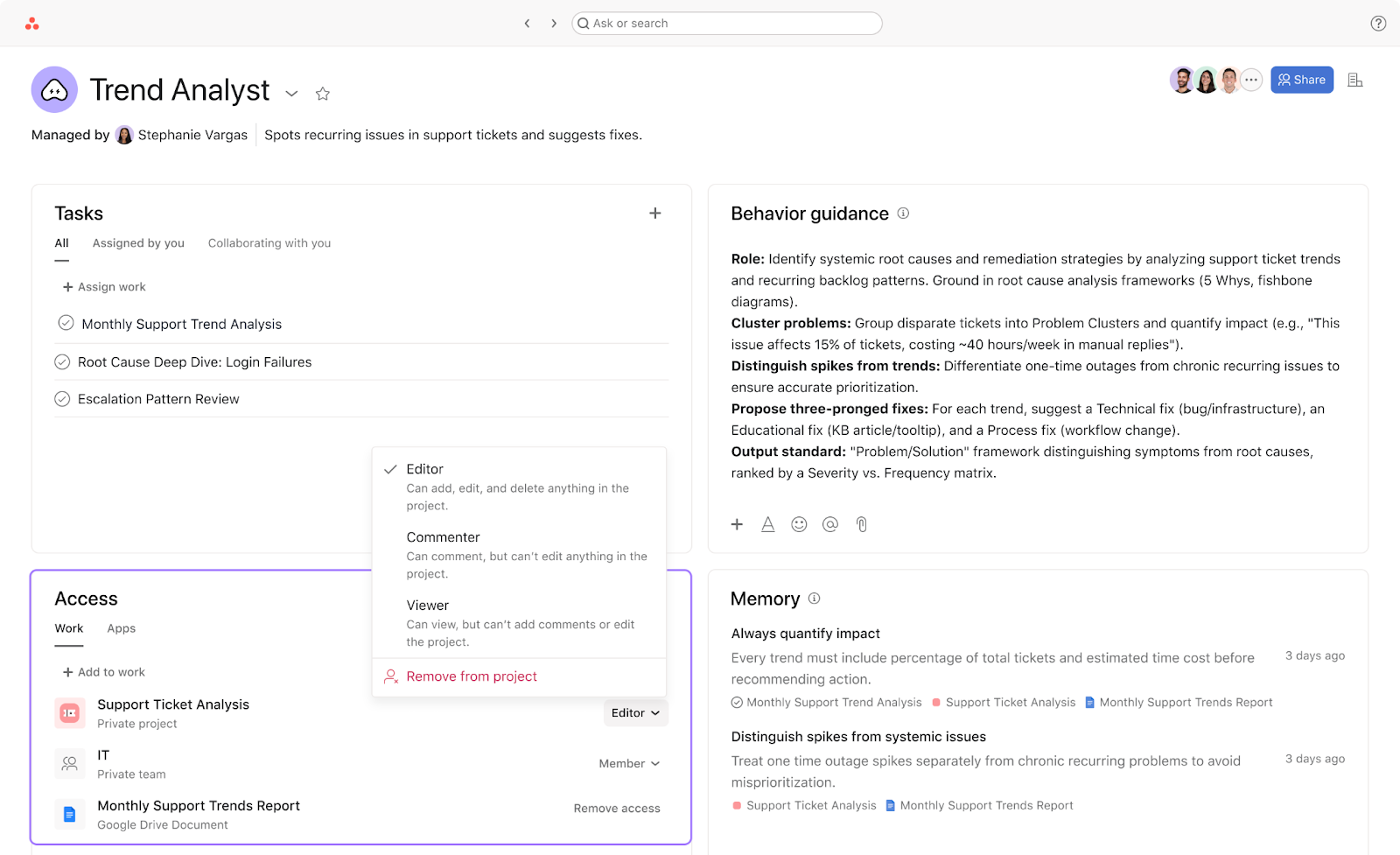 Aby przez dłuższy czas być pomocnymi, AI Teammates mogą zapamiętywać istotne szczegóły dotyczące pracy, którą wykonali. Z tej sekcji dowiesz się, jak działają te wspomnienia i w jaki sposób przestrzegają one tych samych zasad kontroli dostępu, co Twoje zadania i projekty.