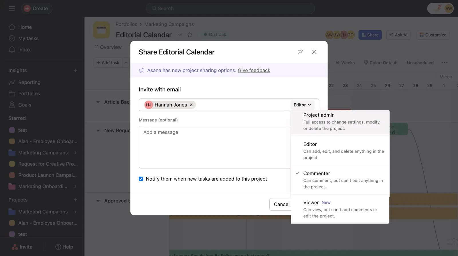 ビューアプロジェクトのアクセスレベルとは、特定のプロジェクトに対してAsanaユーザーに付与された権限を指します。 これは表示専用ライセンスと間違えてはいけません。 ユーザーにビューアのプロジェクトアクセスレベルを割り当て、プロジェクトの詳細を編集する機能を制限するには、ユーザーがAsanaアカウントを持っている必要があります。