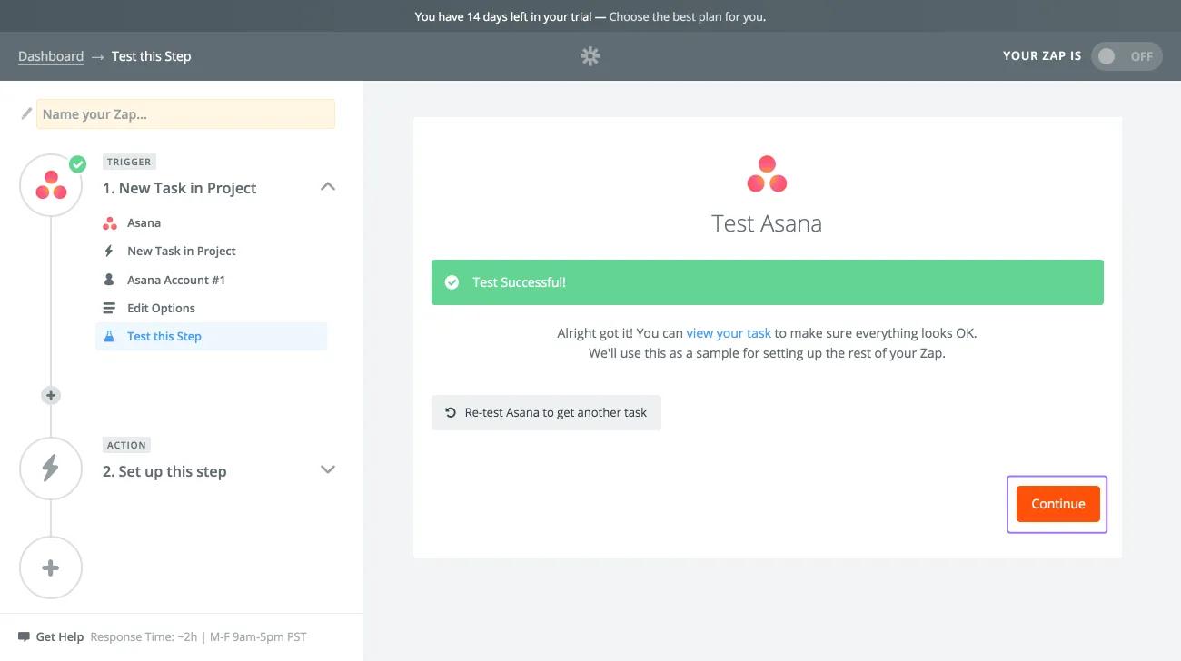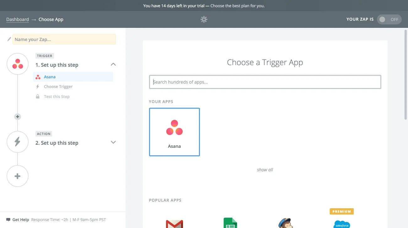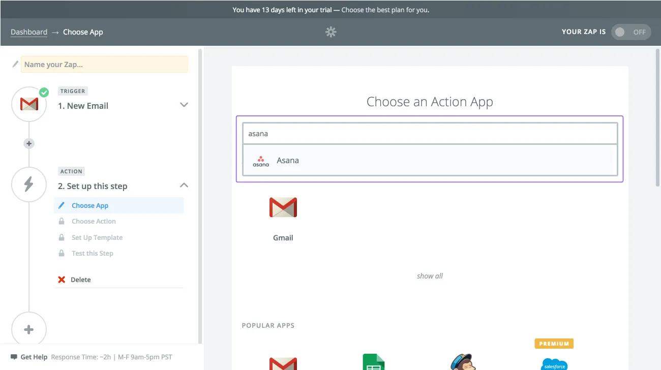 Next, you will select an action app for your zap. Since there are hundreds of possibilities, we will leave it up to you to set up what kind of zap you want to create with Asana.