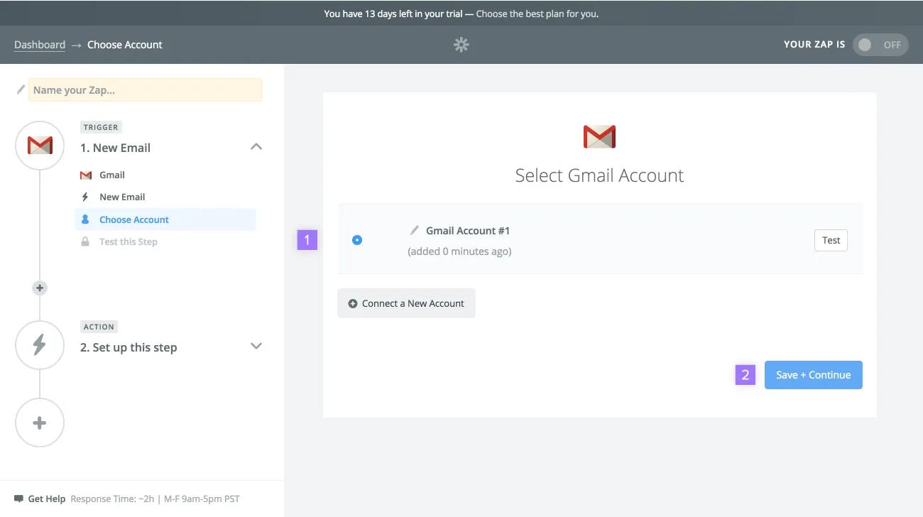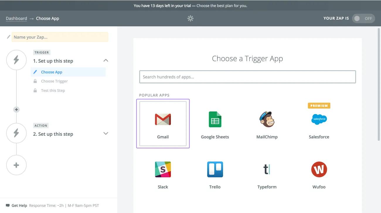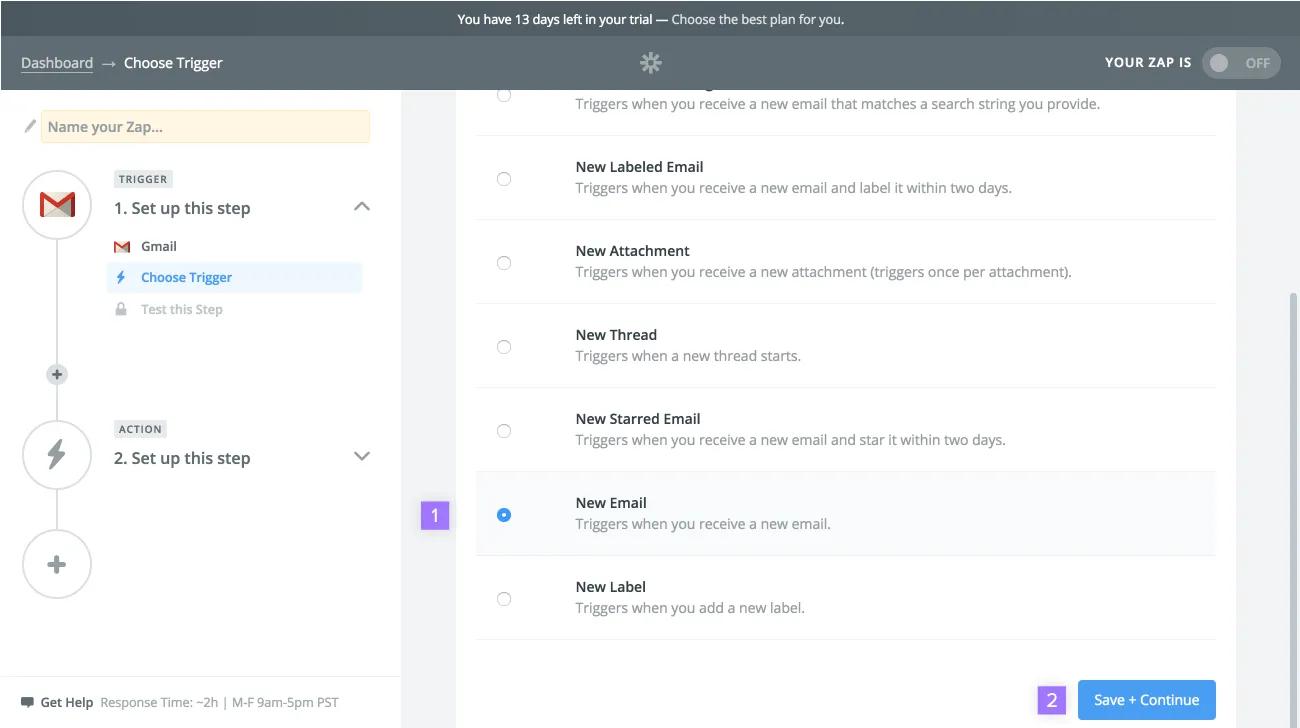 In this example, we will be setting up a zap where if we receive an email in Gmail (the trigger), a task is created in Asana (the action).