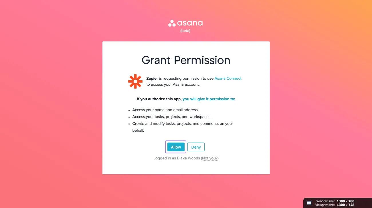 After you select Asana, a new Asana window will popup, click Allow to connect your Asana account with Zapier.