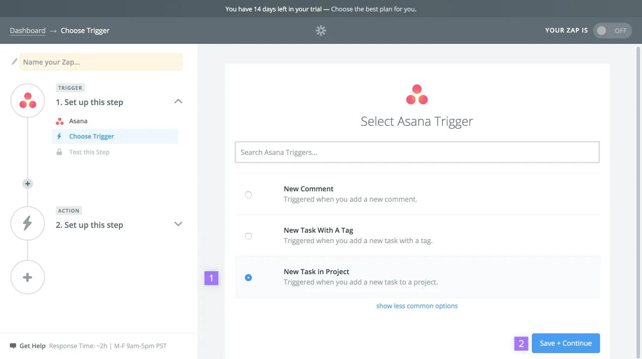 In this type of zap, a trigger that happens in Asana will perform an action in another app.